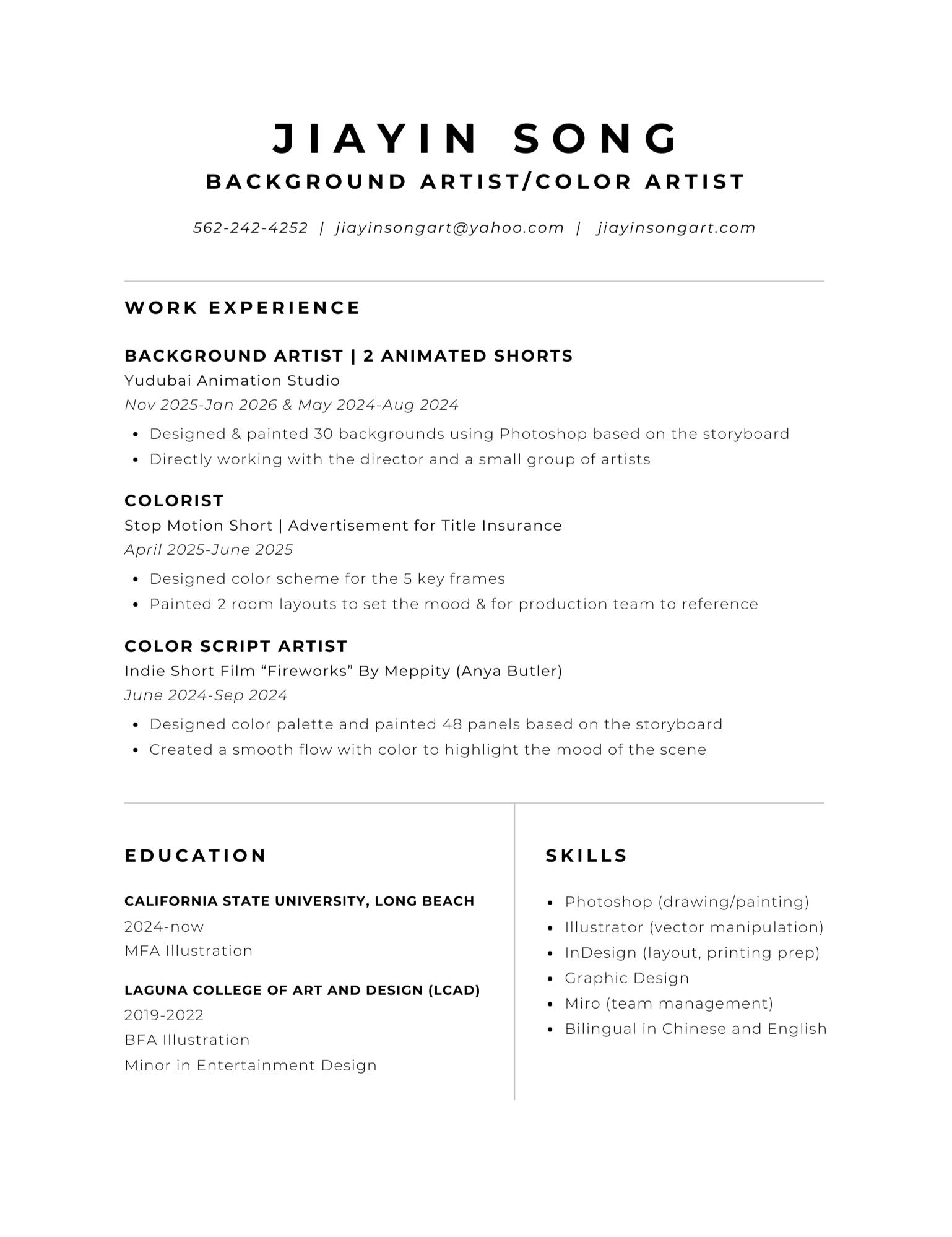 Hello! My name is Jiayin Song (aka Charlotte). I am a SoCal-based background and color artist. Besides my art passion, I love reading, singing, dancing and playing board games with friends (if they are free haha.)